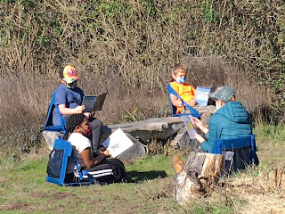Audrey Lareau developed a Forest Kindergarten program at the Pacific School in 2018 and so it didn’t take much to adapt her “Forest Days” for outdoor learning. Before the pandemic Kindergarteners met twice a week at off-campus locations for Forest Days and three times a week in their classroom. To maintain staffing and cohort requirements, Forest Days have been offered once per week this year and an additional day of outdoor in-person learning at the K-8 site was recently added. Students have been tracking water during Forest Days at Bowling Ball Beach, Schooner Gulch and Oz Farm—when the creeks went from dry, to puddled, to flowing; how the creek sometimes moves around at Schooners; the differences at the beach at different tides and how the waves change; which trees make the best canopies for rainy days. Lareau has helped her students understand physical distancing by making little “nests” during snack time; distanced lily pads and clipboards help with circle time when students are practicing their writing skills. Lareau looks forward to adding more in-person Forest Kindergarten days this month as she recognizes “how much the children thrive when they receive direct, live attention and feedback from their teachers and peers.”