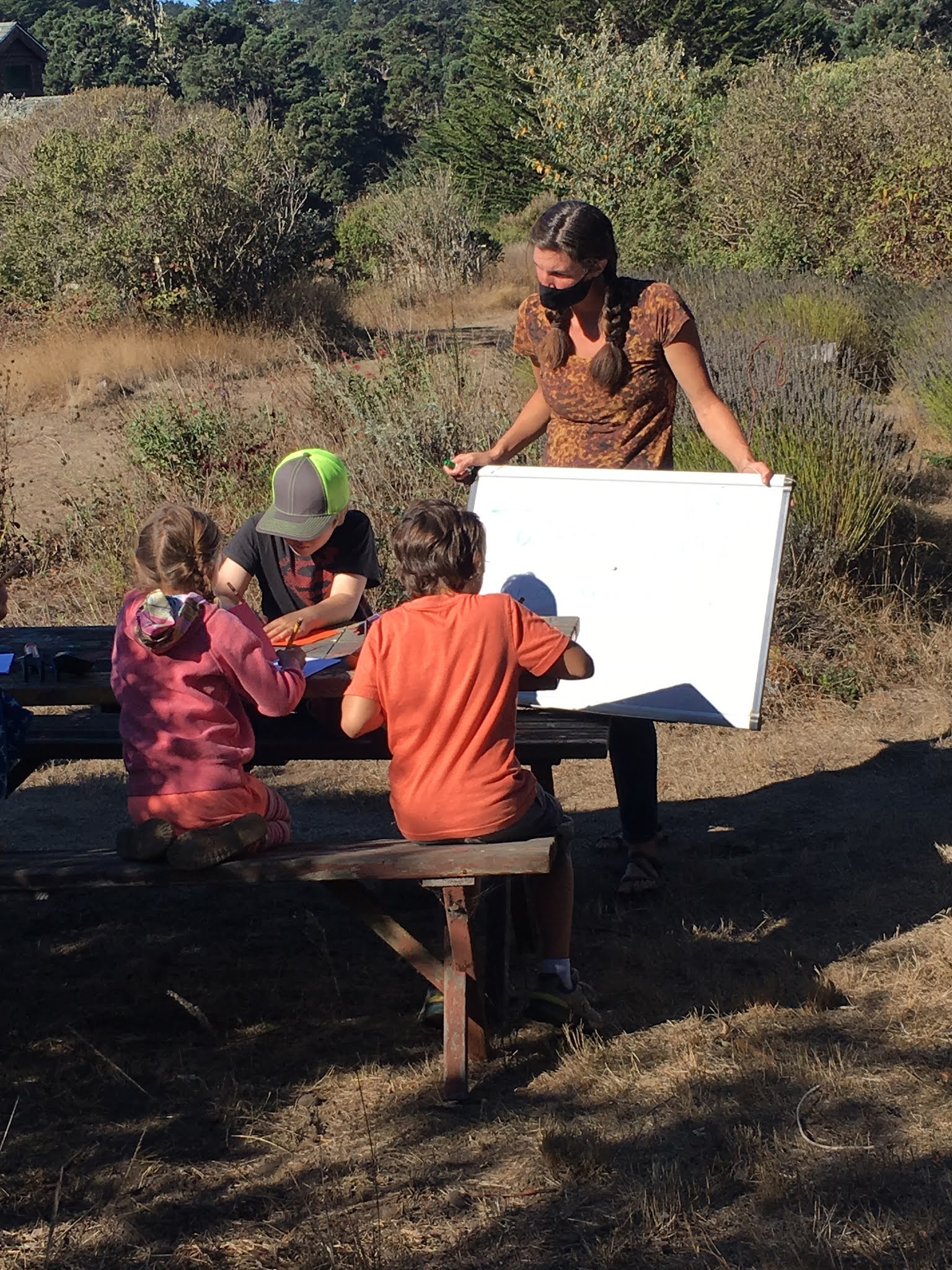 Isabel Kuniholm, a self-described outdoor enthusiast and Pacific School teacher, also meets at Windy Hollow Farm with her 3rd-5th grade class. Instructional Aide Tressla Sarra has brought students to Windy Hollow Farm for garden-based field studies pre-COVID and now provides support with reading, writing and spelling while on the farm. Kuniholm has noticed that “learning outside enables students to constantly be moving and exploring. A math lesson can be quickly diverted by a student’s discovery of a centipede, passing hawk, or a huge gust of wind but this allows for learning to be fluid, flexible and exciting!” Teaching outside is not without its challenges though. As Kuniholm can attest, “the weather can make pencil and paper activities challenging at times, especially during times of heavy rain or wind. Sometimes I feel like students cannot hear me, or everyone’s papers blow away mid lesson. Still, these challenging weather days can also provide great social-emotional and science-oriented learning opportunities for students.” She looks forward to bringing students outdoors for academics on a daily basis post-pandemic.